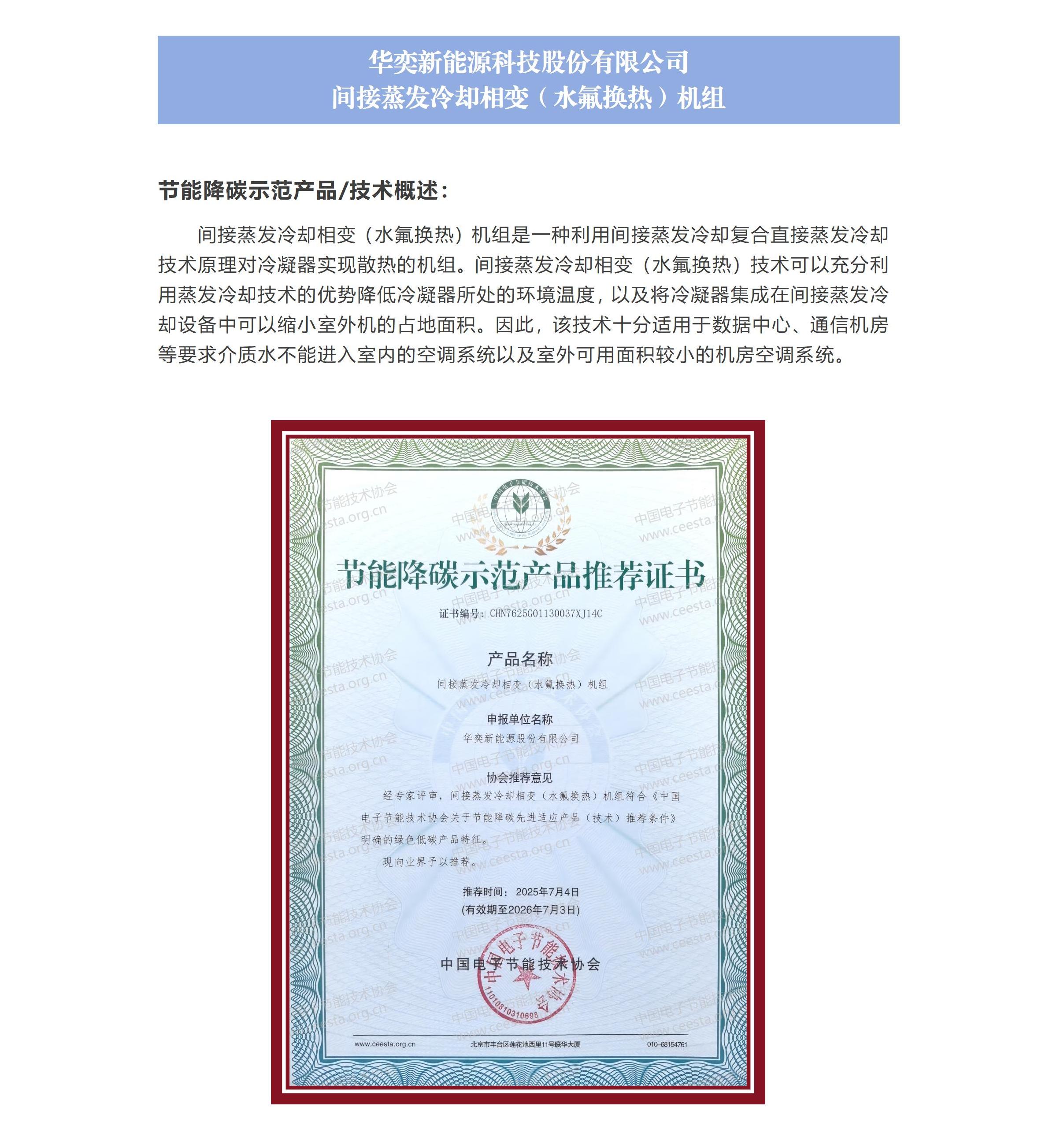 华奕新能源科技股份有限公司 间接蒸发冷却相变(水氟换热)机组
