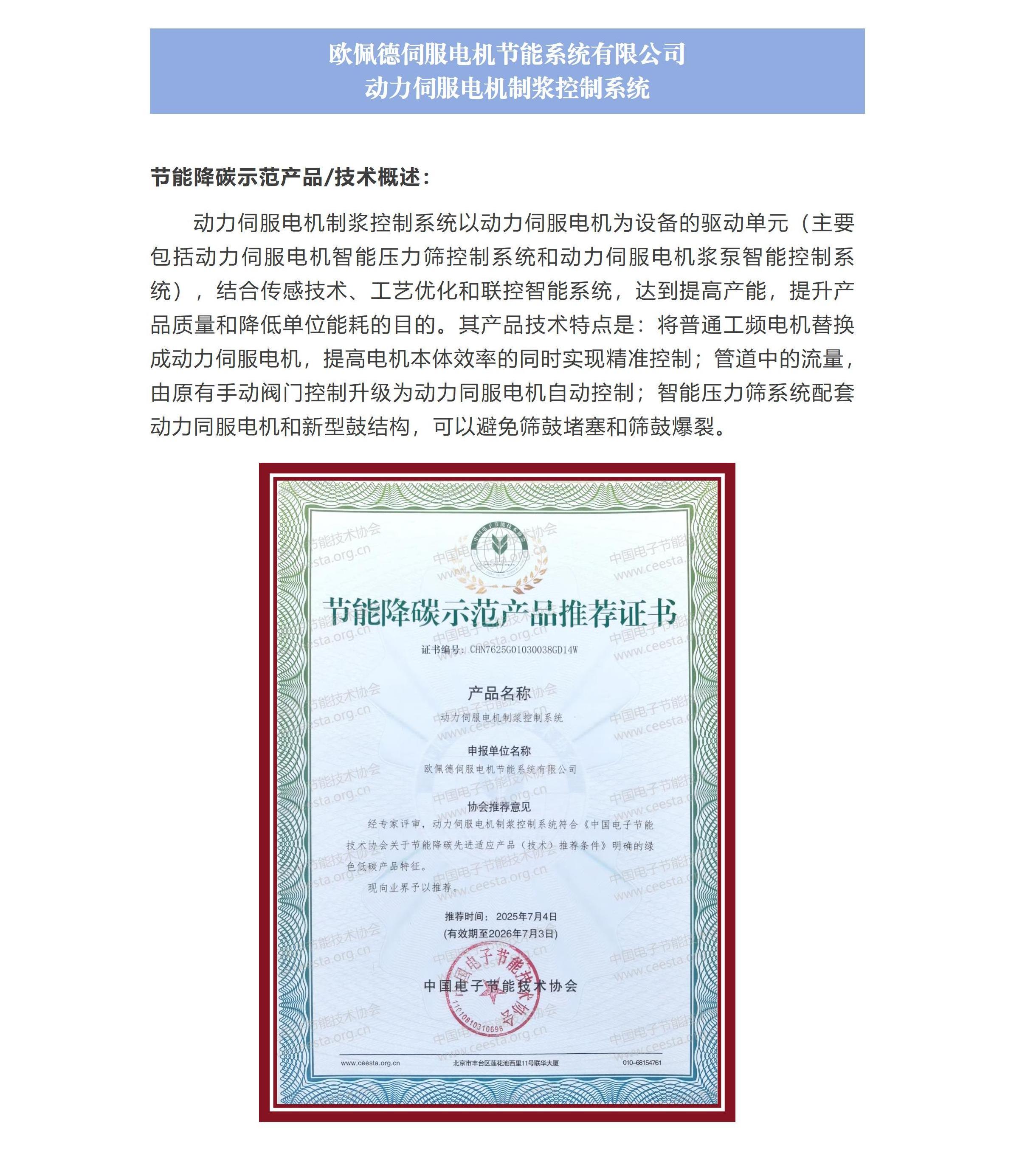 欧佩德伺服电机节能系统有限公司 动力伺服电机制浆控制系统