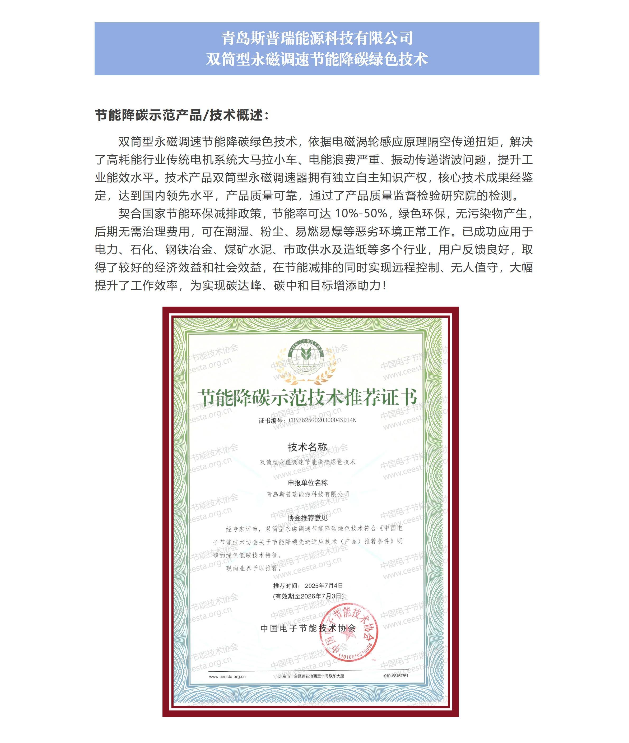 青岛斯普瑞能源科技有限公司 双筒型永磁调速节能降碳绿色技术