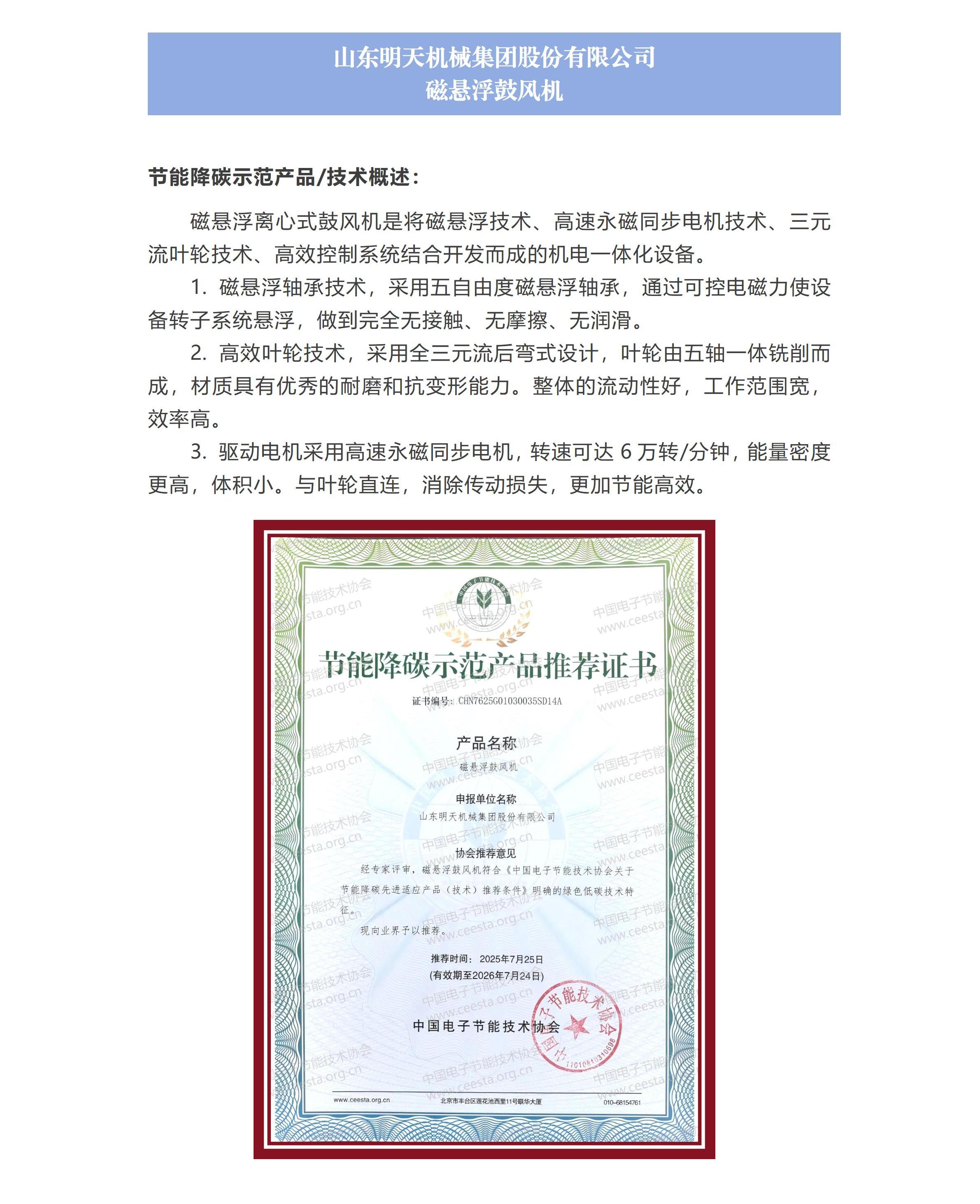 山东明天机械集团股份有限公司 磁悬浮鼓风机