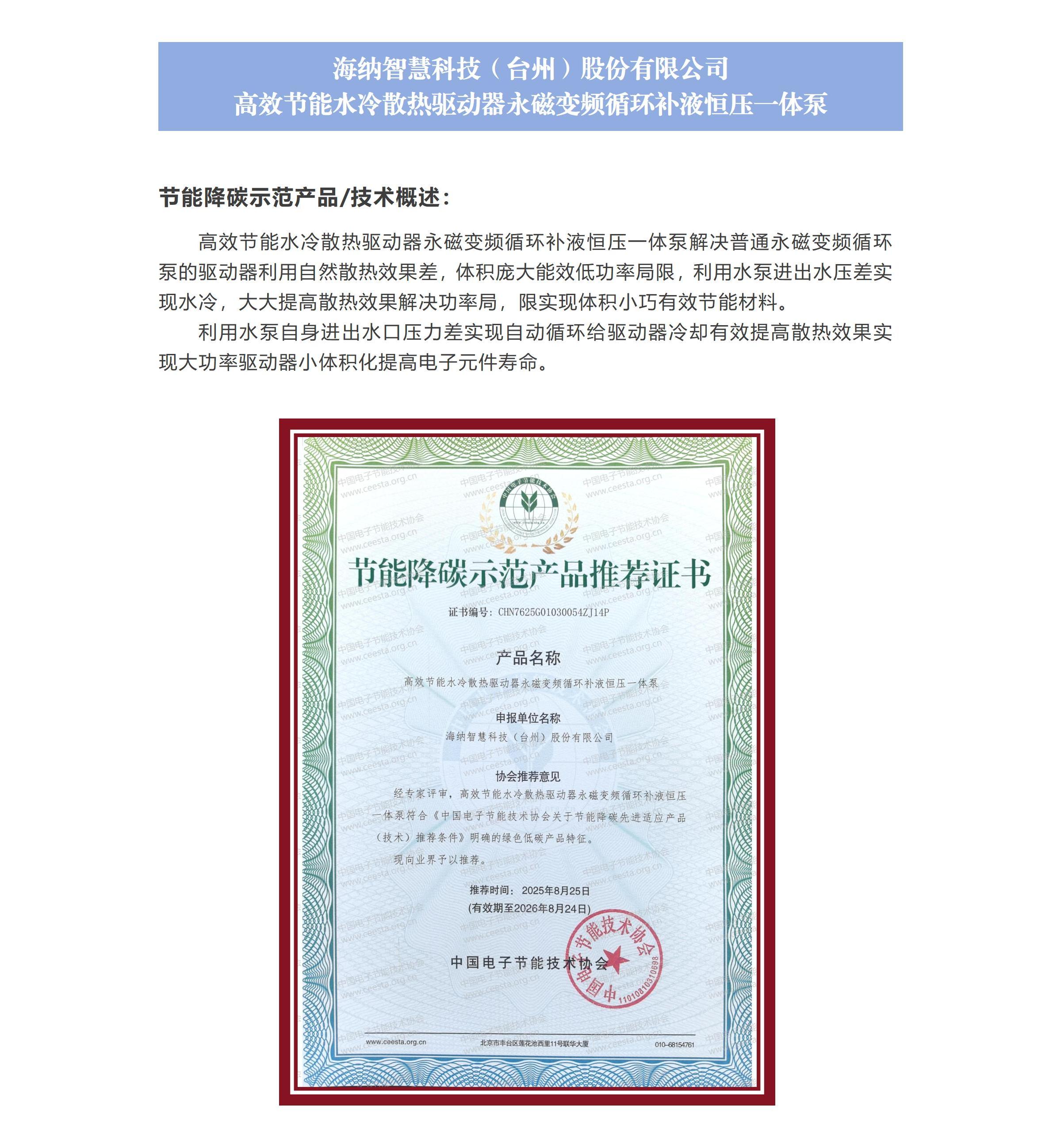 海纳智慧科技(台州)股份有限公司 高效节能水冷散热驱动器永磁变频循环补液恒压一体泵