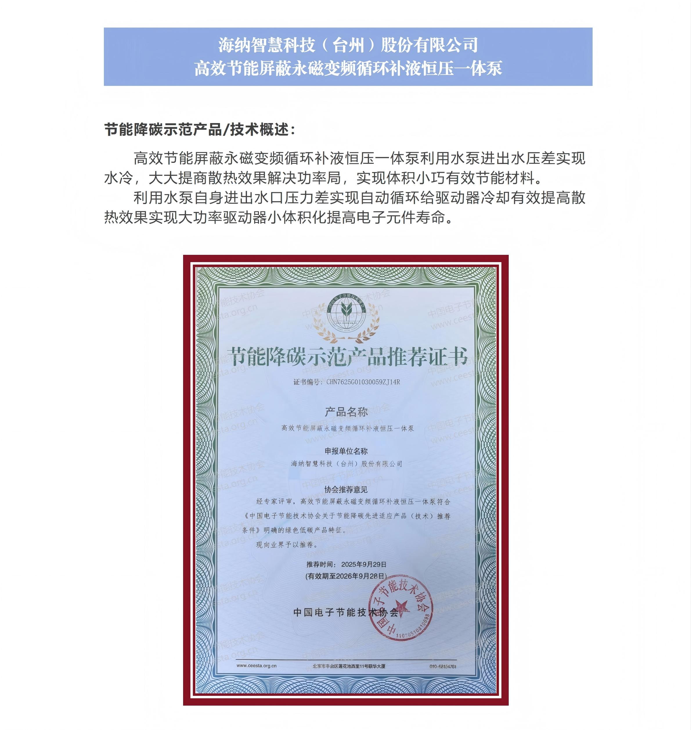 海纳智慧科技(台州)股份有限公司 高效节能屏蔽永磁变频循环补液恒压一体泵