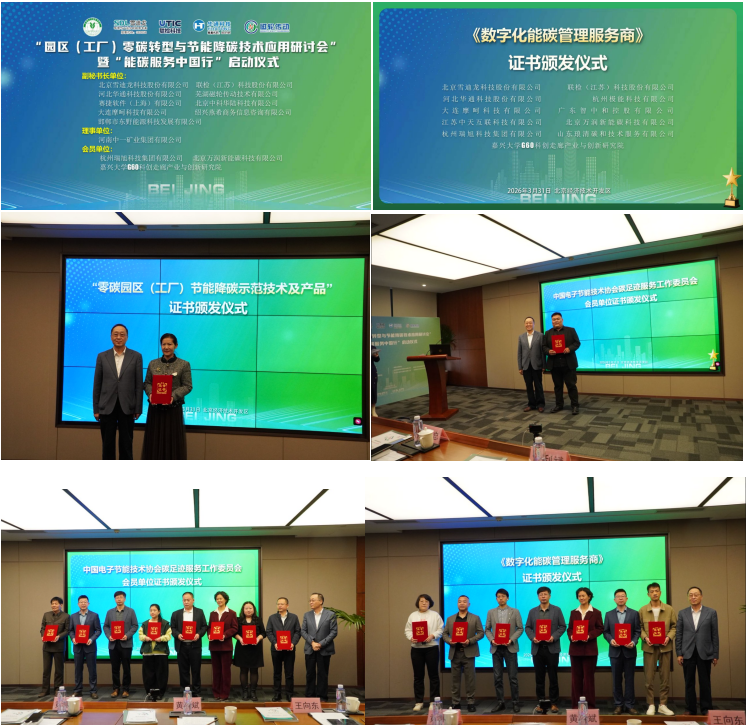 同步研讨会上举行了协会会员证书、“数字化能碳管理服务商”证书颁发仪式,正式启动“能碳服务中国行”,推动能碳服务资源下沉,助力各地园区与工厂零碳转型;同时为“零碳园区(工厂)节能降碳示范技术产品”颁发证书,推广优质节能降碳技术成果,加速技术与产业场景融合。